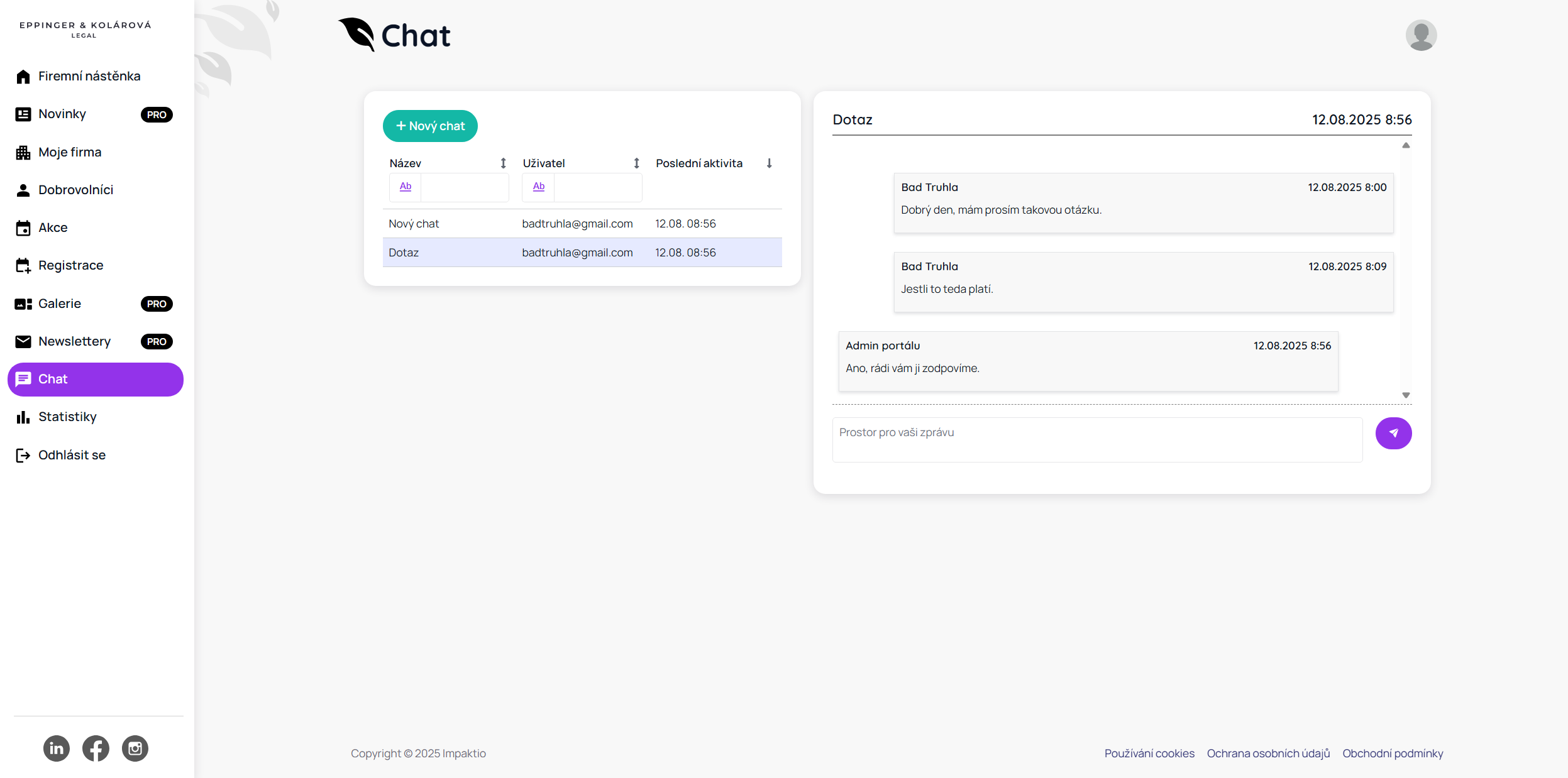 Zažijte rychlou a bezstarostnou organizaci dobrovolnických aktivit s portálem Impaktio. Po jednoduché registraci vidí dobrovolníci aktivity, na které se mohou přihlašovat individuálně nebo v týmech. Můžou je také plánovat dopředu, nebo se snadno odhlásit. Připomínky, notifikace a aktualizace probíhají automaticky. K dispozici máte nástroje pro rychlou komunikaci s dobrovolníky. Zbavte se papírování a soustřeďte se na to podstatné – skutečnou pomoc. Portál je postaven na nejvyšších standardech softwarové bezpečnosti.