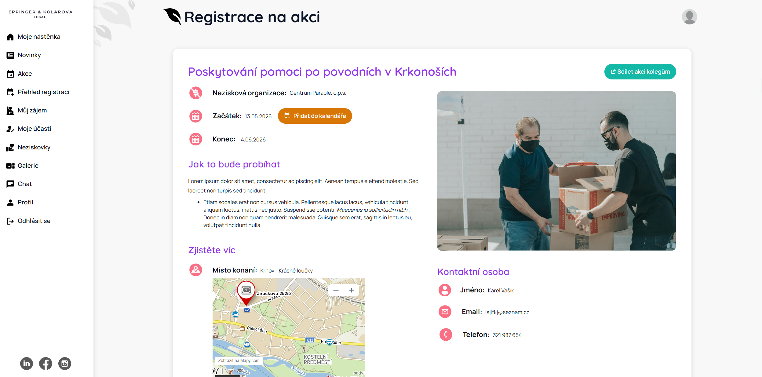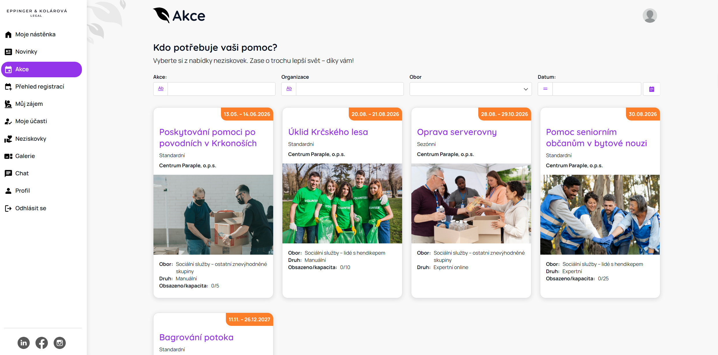 - Snadno vystavíte i přizpůsobíte akce pro dobrovolníky.